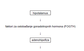 Na shemi je nedovršeni prikaz razina koje rezultiraju izlučivanjem spolnih hormona u žene. Dopunite shemu tako da na prazne crte (48.1. i 48.2.) upišete pune nazive odgovarajućih hormona.