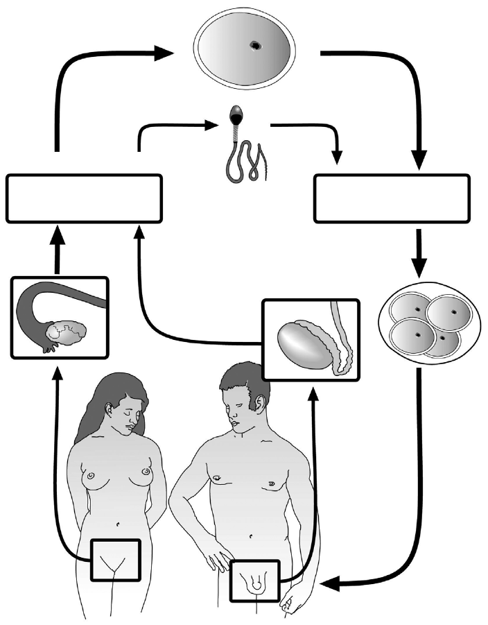 51.2. Upišite riječi „mejoza" i „oplodnja" na za to predviđena mjesta u pravokutnicima na slici.