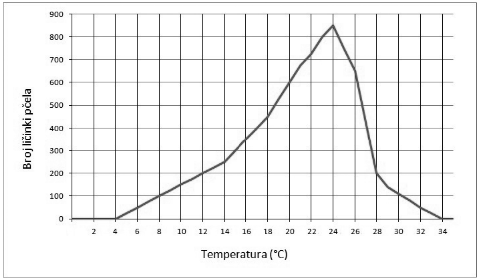 Slika prikazuje ovisnost broja ličinki pčela izlegnutih iz jajašaca pri određenim temperaturama.