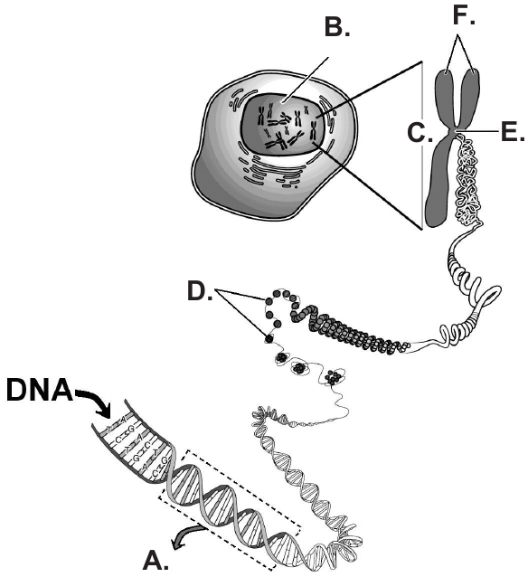 46.2. Kako se nazivaju molekule proteina, na slici označene slovom D., na koje se „namotava" makromolekula DNA?