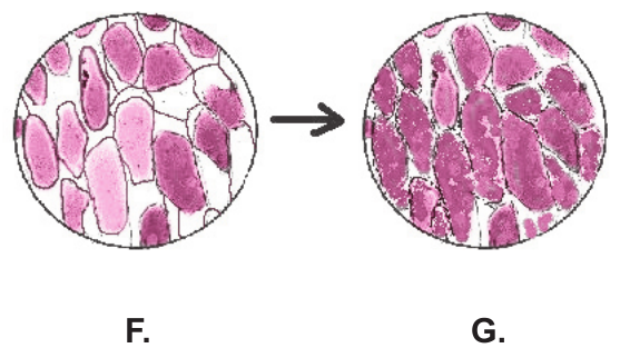 14. Slika prikazuje stanice pokožice ljubičastoga luka u koncentriranoj otopini šećera, označene na slici slovom F. i stanice pokožice ljubičastoga luka u vodi označene na slici slovom \mathbf{G}.