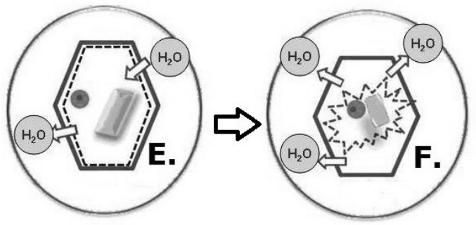 28. Stanice luka promatrane su mikroskopom u otopini označenoj slovom E., a zatim su prebačene u otopinu označenu slovom 𝐹. Slika prikazuje promjenu koja se pritom dogodila. Kakve su otopine E. i F. u odnosu na citoplazmu stanica luka?