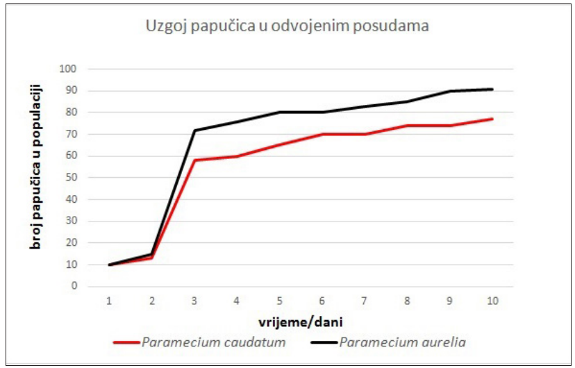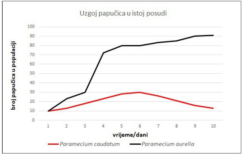 46. Slike prikazuju promjene brojnosti populacija papučica vrsta Paramecium caudatum i Paramecium aurelia tijekom istraživanja.