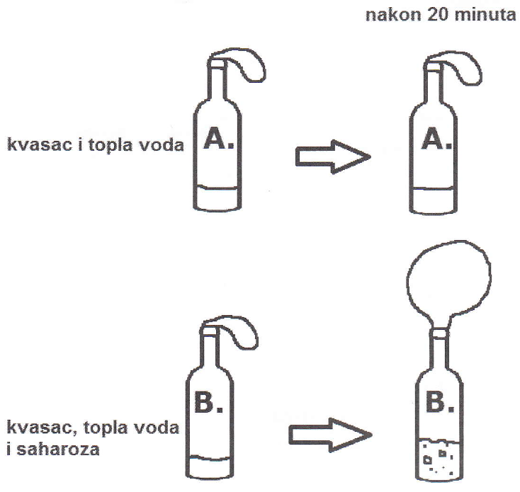 55. Ana i Mislav proučavali su kvasac pri različitim životnim uvjetima. U boce označene slovima A. i B. stavili su kvasac i toplu vodu. U bocu označenoj slovom B. dodali su još i saharozu. Na otvor boca stavili su balone. U 20. minuti uočili su promjenu prikazanu na slici. Nakon 45 minuta primijetili su da se balon na boci označenoj slovom B. prestao puniti plinom. Kada su skinuli balone s boca, intenzivan se miris širio samo iz boce označenoj slovom B.