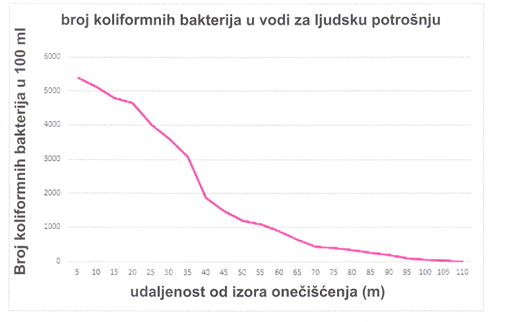65.4. Slika prikazuje povezanost broja koliformnih bakterija u bunarskoj vodi s udaljenosti od izvora onečišćenja. U literaturi se navodi da u 100 ml uzorka vode ne smije biti bakterija i da je takva voda prihvatljiva za ljudsku potrošnju.