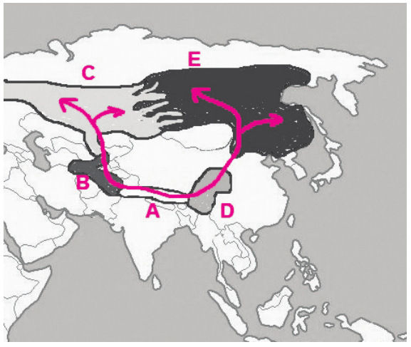 16. Na slici je prikazana karta populacija vrste ptice „zelenkasti zviždak" čija su staništa šume u kojima love kukce. Strelice pokazuju smjer širenja početne populacije A i nastanak novih populacija B, C, DiE tijekom više tisuća godina.