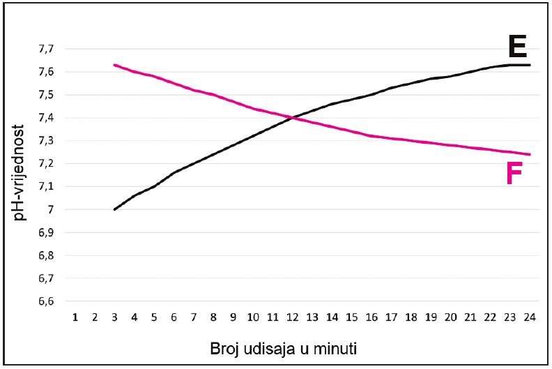 A. krivulja E jer se koncentracija \(\mathrm{H}^{+}\)iona povećava smanjivanjem broja udisaja u minuti