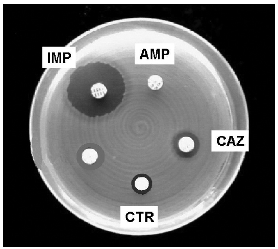 47. Na slici su prikazani rezultati antibiograma. Kratice na slici označavaju diskove s različitim antibioticima koji su u istim dozama postavljeni na hranidbenu podlogu s uzgojenim bakterijama istoga soja.