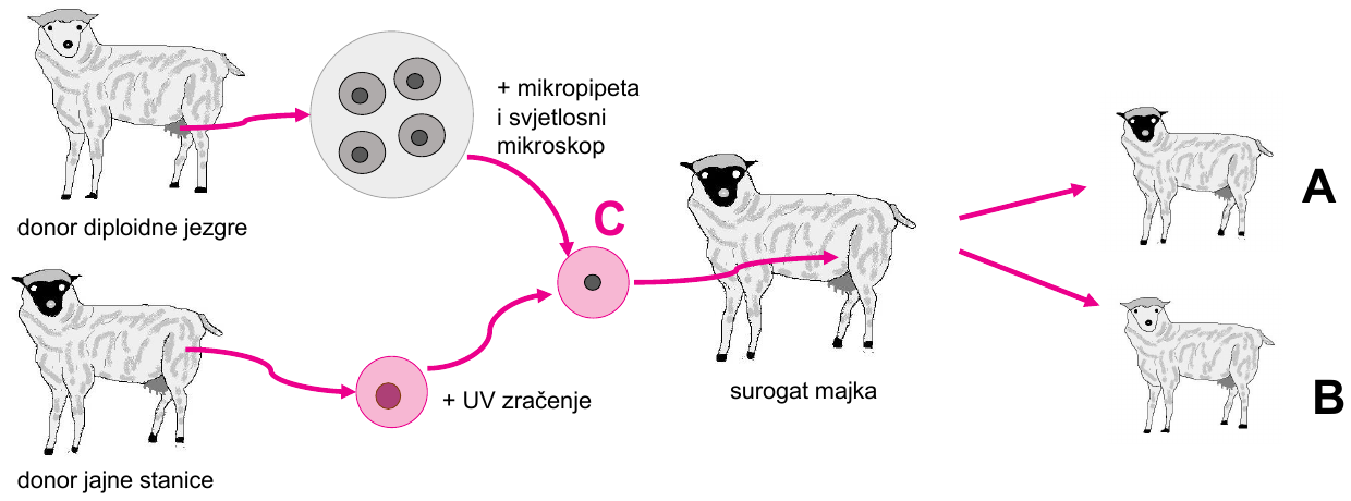 43.1. Objasnite koje će janje, A ili B, ojanjiti ovca (surogat-majka) u koju je unesena jajna stanica označena na slici slovom C. Boja njuške određena je genima jezgrine DNA.