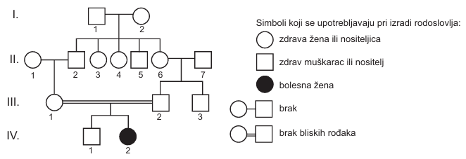 46.2. Napišite genotip ili moguće genotipove muškarca iz III. generacije označenoga brojem 2 za obilježje koje se prati rodoslovnim stablom. Alele označite nekim slovom hrvatske abecede.