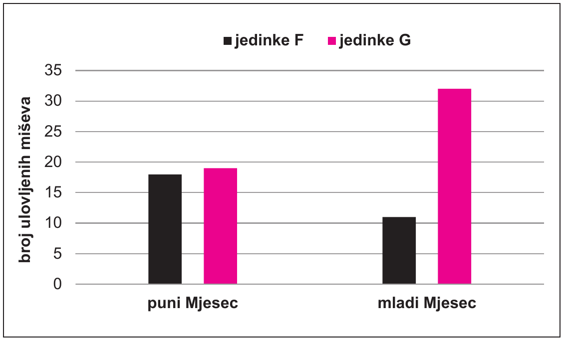 Provedeno je istraživanje utjecaja različitih boja krzna jedinka miševa iste vrste na mogućnost preživljavanja. Isti broj miševa različitih boja krzna pušten je tijekom noći u ograđeno područje tla svijetle boje u kojemu su se nalazile sove. Pozorno promotrite sliku na kojoj je prikazan broj miševa ulovljenih ovisno o fazi Mjeseca.