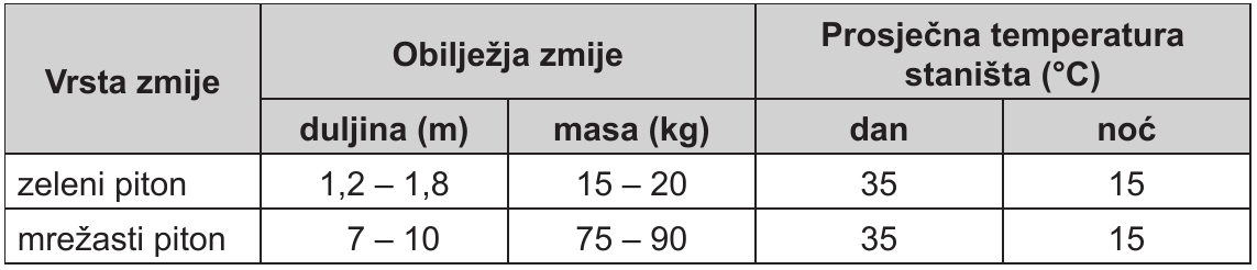 Pozorno promotrite tablicu u kojoj su navedena obilježja dviju vrsta zmija i temperatura staništa u kojima obitavaju.
