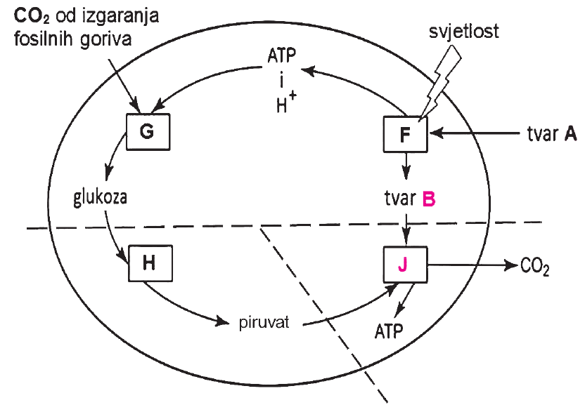 Pozorno promotrite sliku na kojoj su pojednostavljeno prikazani metabolički procesi koji se događaju u stanici zelene alge roda Chlorella. Slovima F, G, H i J označeni su procesi koji se događaju u stanici. Isprekidane linije dijele prikaz na tri vremenski i prostorno odvojena metabolička procesa.