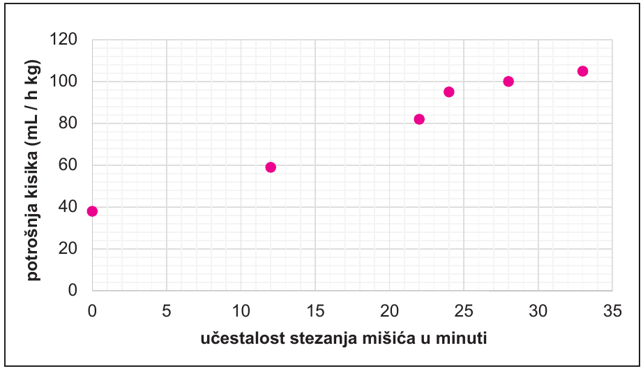 Burmanski piton vrsta je zmije specifičnoga procesa razmnožavanja. Ženke te vrste tijekom inkubacije tijelom obaviju jaja pri čemu učestalo stežu mišiće, što nazivamo drhtanje. Pozorno promotrite sliku na kojoj su prikazani rezultati istraživanja potrošnje kisika tijekom stezanja mišića ženke burmanskoga pitona u procesu inkubiranja jaja pri stalnoj temperaturi okoliša.