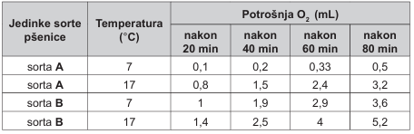 Agronomi su istraživali potrošnju kisika dviju sorta pšenice pri različitim temperaturama. U postavljenome pokusu zrna pšenice obiju sorta klijala su na vlažnim papirnatim ručnicima u istim uvjetima. Nakon što su biljke isklijale, mjerena je potrošnja kisika sorta A i B na temperaturama $7^{\circ} \mathrm{C}$ i $17^{\circ} \mathrm{C}$ u vremenskim intervalima od 20, 40, 60 i 80 minuta.
