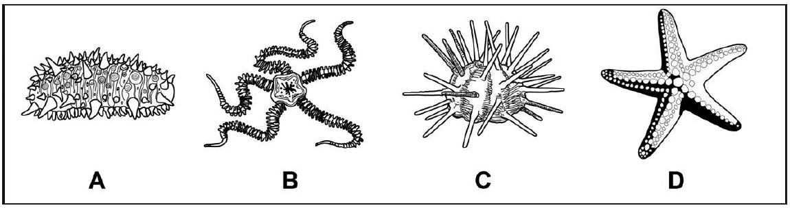 53. Pozorno promotrite sliku na kojoj su prikazani predstavnici bodljikaša označeni slovima od $\mathbf{A}$ do $\mathbf{D}$.