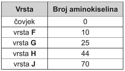 Pozorno promotrite tablicu koja prikazuje broj aminokiselina po kojemu se razlikuje hemoglobin životinjskih vrsta označenih slovima od F do J u odnosu na hemoglobin čovjeka.