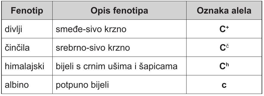 Boju krzna kunića određuju četiri različita alela u populaciji. Njihova ekspresija daje četiri različita fenotipa: divlji, činčila, himalajski i albino. Pozorno promotrite tablicu u kojoj su opisani navedeni fenotipovi i navedene oznake alela.