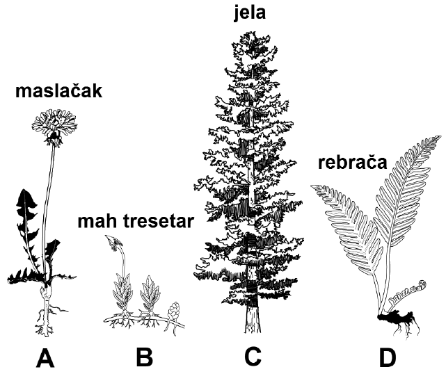 Pozorno promotrite sliku koja prikazuje predstavnike različitih biljnih skupina označenih slovima od A do D.
