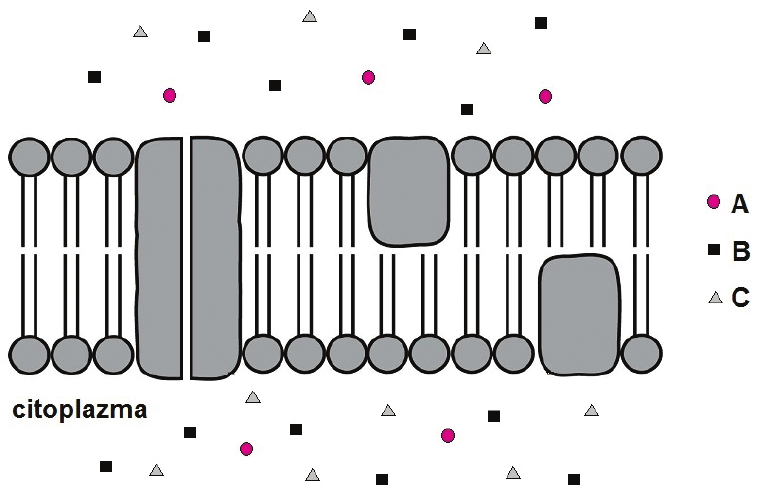 Pozorno promotrite sliku koja prikazuje čestice A, B i C s dvije strane stanične membrane i relativne odnose njihovih koncentracija u staničnoj i izvanstaničnoj tekućini.