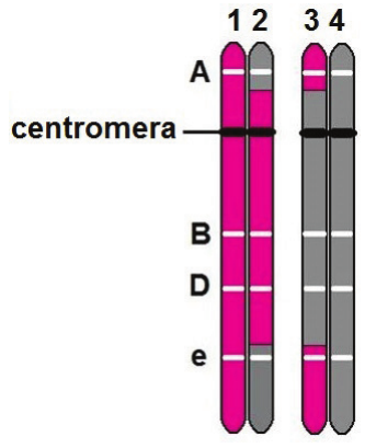 Pozorno promotrite sliku koja prikazuje par homolognih kromosoma u jednoj stanici čovjeka s označenim lokusima gena. Kromosomi su se prije kromatidne izmjene (krosingovera) međusobno razlikovali samo u dominantnosti alela čiji je lokus na kraćemu kraku.