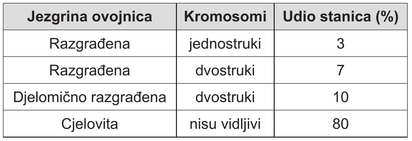 Pozorno promotrite tablicu koja prikazuje rezultate mikroskopiranja stanica u uzorku tkiva vegetacijskoga vrška korijena luka. Pregledano je 500 stanica i zabilježen je izgled jezgre i kromosoma.