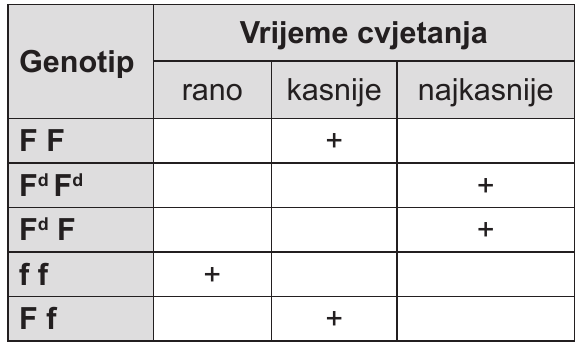 Pozorno promotrite tablicu koja prikazuje vremenski redoslijed cvjetanja graška ovisno o genotipu. Vrijeme cvjetanja graška određeno je trima alelima: F, Fd if.
