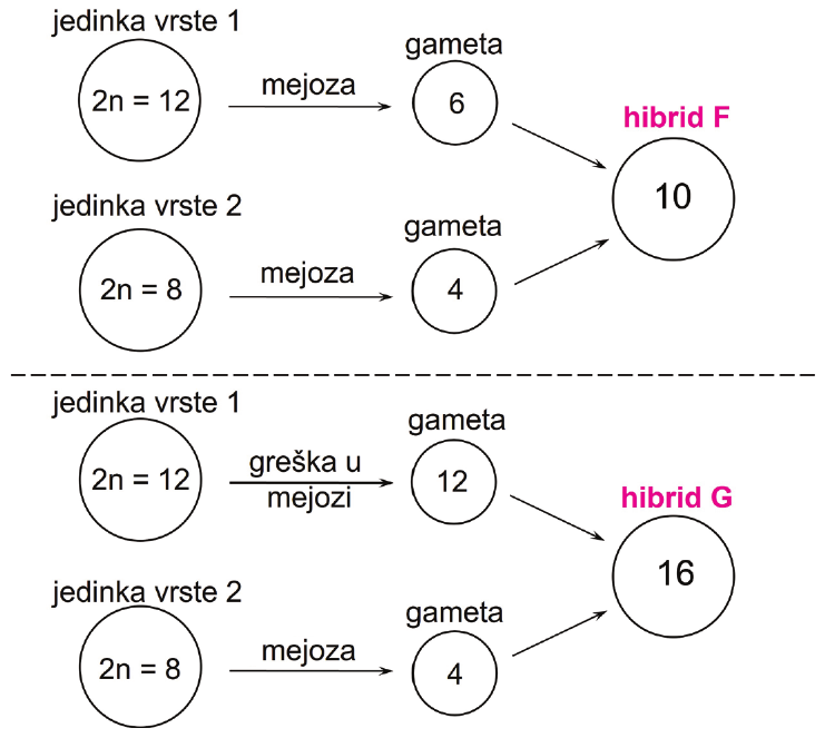 Pozorno promotrite sliku koja prikazuje križanje jedinki biljnih vrsta 1 i 2, pri čemu nastaju njihovi hibridi označeni slovima FiG. Brojkama je označen broj kromosoma.