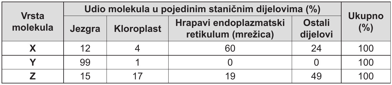 Pozorno promotrite tablicu koja prikazuje raspodjelu molekula označenih u tablici slovima\(\mathbf{X , Y i Z}\) po navedenim staničnim dijelovima u nekoj biljnoj stanici.
