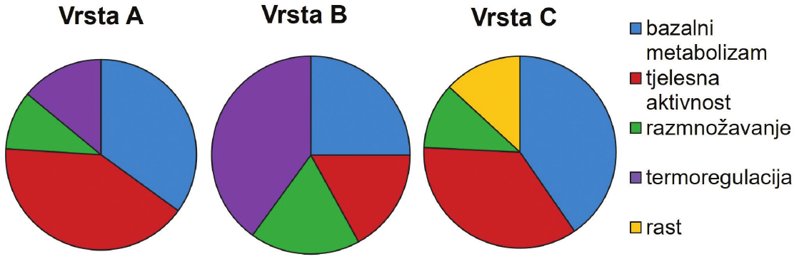 Pozorno promotrite sliku koja prikazuje udjele potrošnje energije na različite životne procese odraslih jedinki triju vrsta kopnenih kralježnjaka označenih slovima A, B i C.