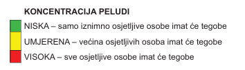 Pozorno promotrite tablicu koja prikazuje prisutnost i relativnu koncentraciju peludi nekih vrsta biljaka u zraku po mjesecima s pripadajućom legendom u kojoj je navedena pojava tegoba kod osoba alergičnih na pelud.