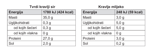 50.1. Koja vrsta hranjivih tvari navedena u tablicama najviše pridonosi većoj energijskoj vrijednosti tvrdoga kravljeg sira u odnosu na mlijeko?