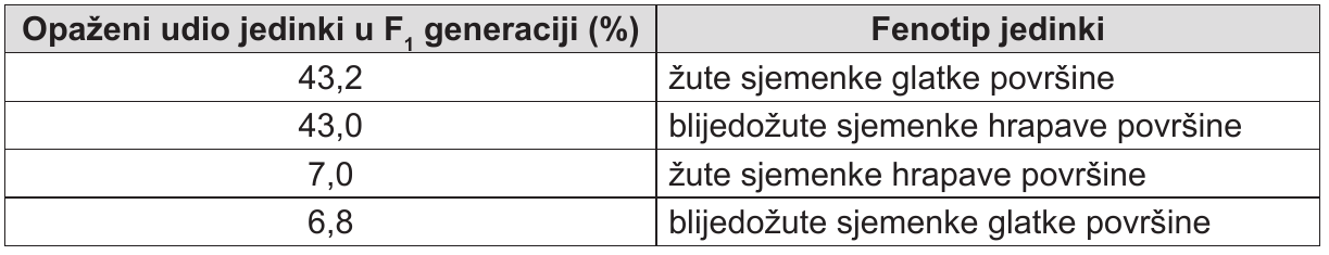 54.3. Pozorno promotrite tablicu koja prikazuje rezultate jednoga testnog križanja kukuruza sheterozigotom za oba svojstva.