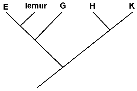 Pozorno promotrite sliku koja prikazuje srodstvene odnose pet različitih vrsta: lemura, klokana, dupina, koale i čovjeka. Na kladogramu je imenovana jedna vrsta, a ostale vrste označene su slovima od E do K.