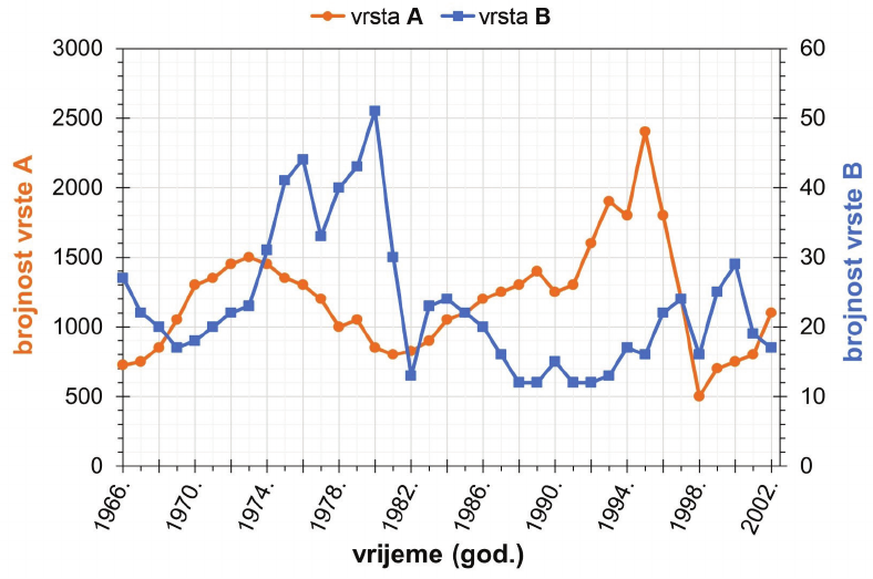 Pozorno promotrite sliku koja prikazuje odnos brojnosti jedinki životinjskih vrsta, označenih slovima A i B, tijekom vremena.