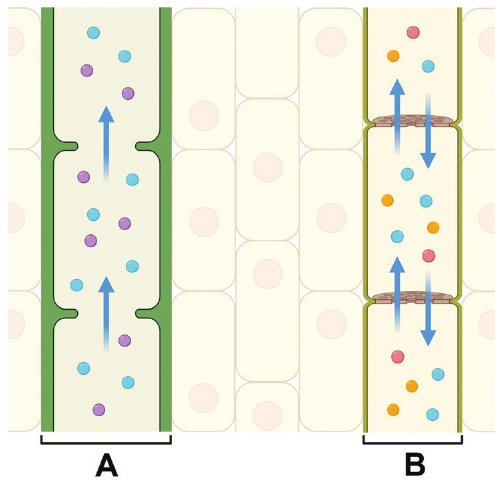 Pozorno promotrite sliku koja prikazuje dvije vrste provodnih cijevi označenih slovima A i B. Strelicama je prikazan smjer prijenosa tvari.