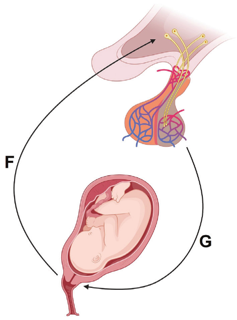 D. Izlučivanje oksitocina označeno je slovom \(\mathbf{G}\), a slanje živčanih impulsa slovom \(\mathbf{F}\).