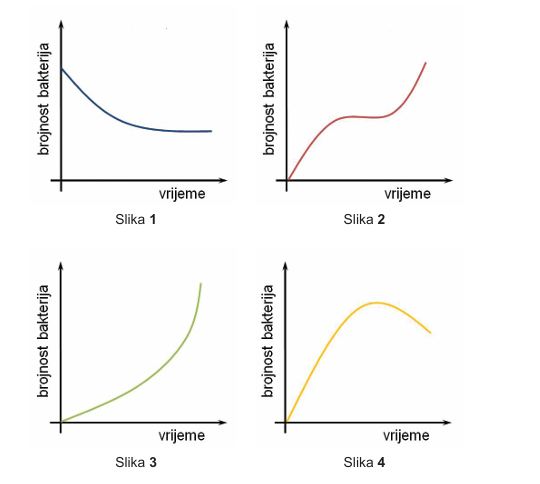 Pozorno promotrite slike, označene brojevima od 1 do 4, koje prikazuju krivulje rasta bakterijskih populacija u različitim uvjetima izvora hrane i nakupljanja otpadnih tvari metabolizma bakterija.