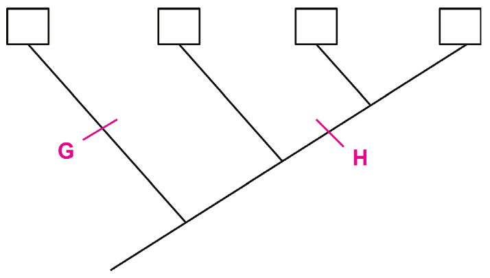 43.2. Koja su obilježja iz tablice označena slovima G i H na filogenetskome stablu prikazanome u prethodnome zadatku?