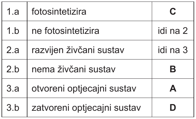 43.1. Na prikazu filogenetskoga stabla upišite slova vrsta iz dihotomskoga ključa u odgovarajuća prazna polja.