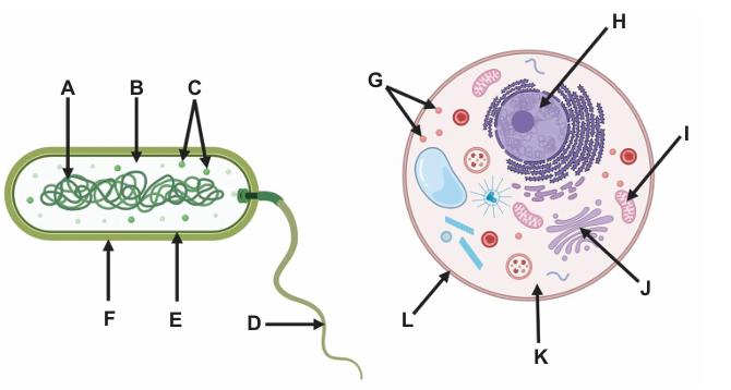 Pozorno promotrite sliku na kojoj su pojedini dijelovi prokariotske i eukariotske stanice označeni slovima od A do L.