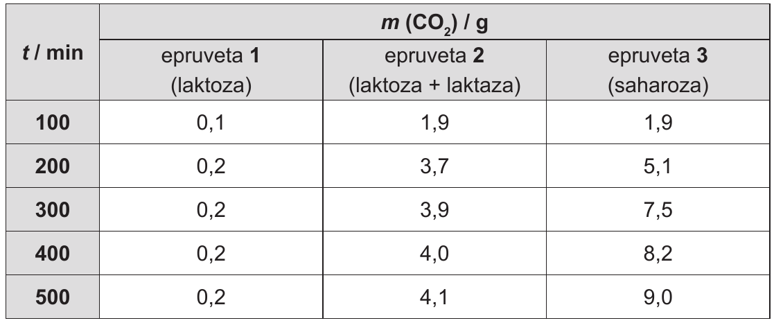Provedeno je istraživanje utjecaja saharoze i laktoze na metabolizam kvasca. U tri epruvete s istom količinom svježe suspenzije kvasca dodano je redom: u prvu epruvetu 20 g laktoze, u drugu 20 g laktoze i enzim laktaza, a u treću 20 g saharoze. Pozorno promotrite tablicu koja prikazuje masu nastaloga ugljikova(IV) oksida tijekom 500 minuta mjerenja.