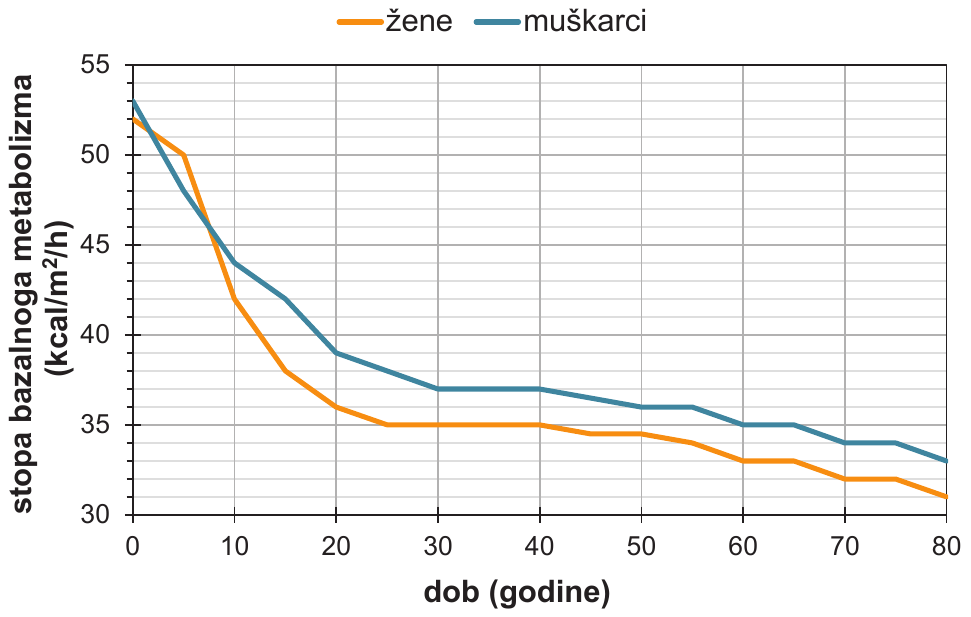 Pozorno promotrite sliku koja prikazuje promjene intenziteta bazalnoga metabolizma u populaciji čovjeka tijekom godina.
