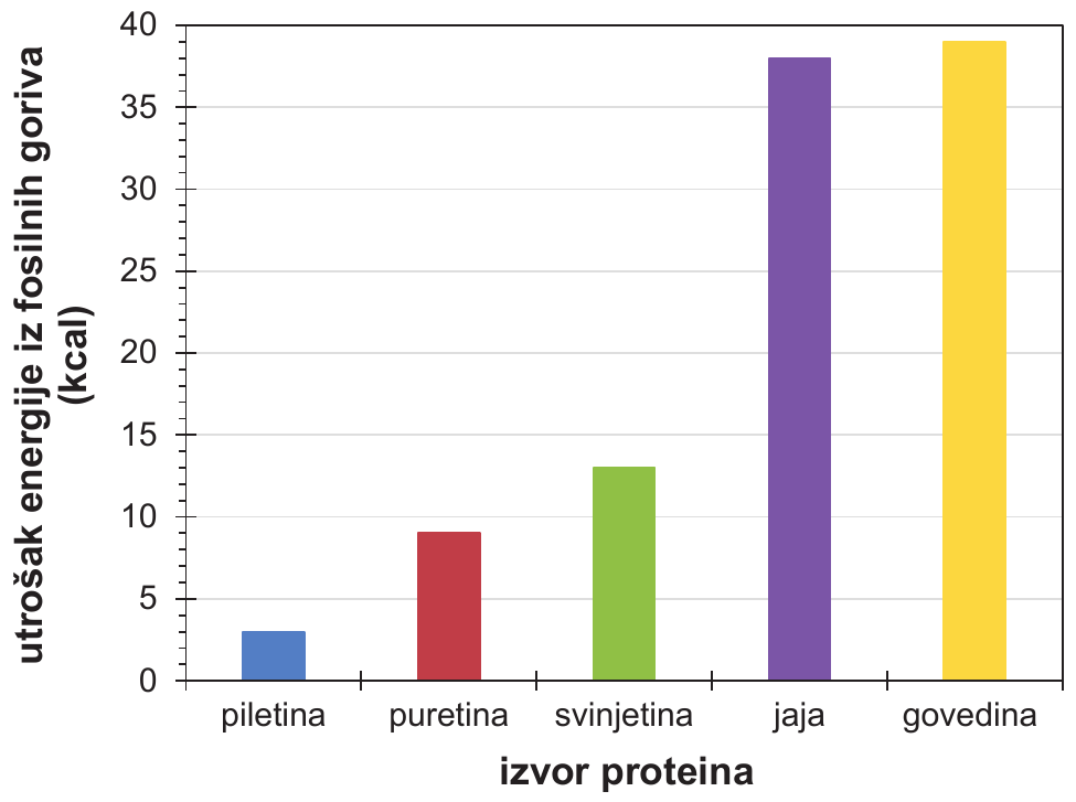 Pozorno promotrite sliku koja prikazuje odnos potrošnje energije iz fosilnih goriva potrebne da se proizvedu proteini iste energijske vrijednosti iz različitih izvora hrane.