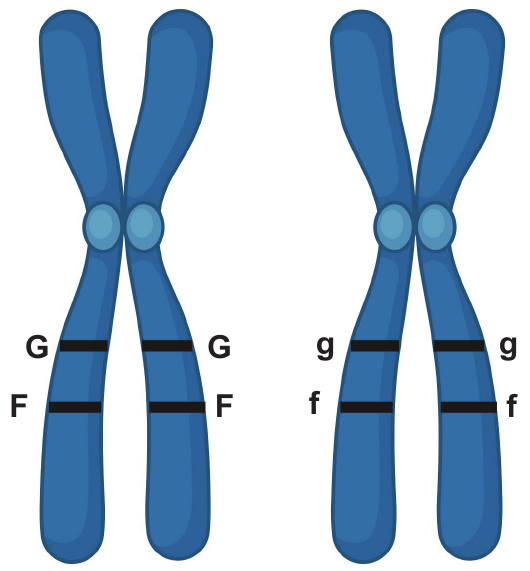 Gubitak sluha u osoba oboljelih od Pendredova sindroma određen je alelom \mathbf{g}, a normalan sluh alelom G. Oštećenje pluća uslijed cistične fibroze određeno je alelom f, a razvoj zdravih pluća alelom F. Pozorno promotrite sliku koja prikazuje položaje alela na kromosomima u tjelesnim stanicama jedne žene.