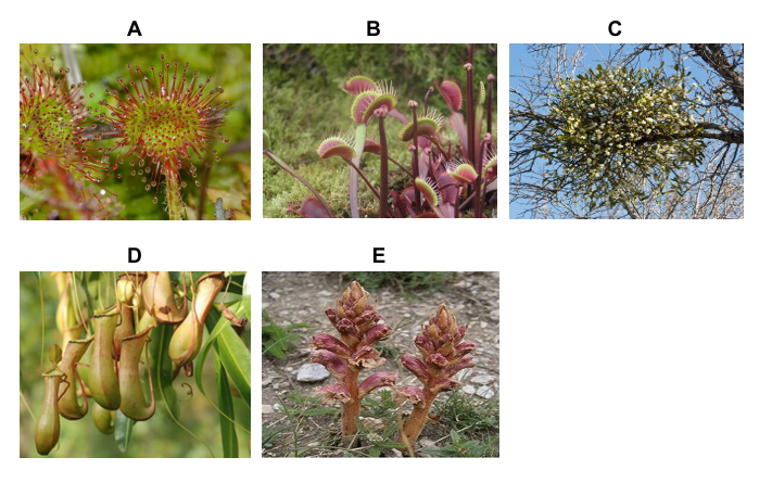 54.3. Koji je tip prehrane karakterističan za biljku označenu slovom E na slici? Odgovor potkrijepite vidljivim morfološkim obilježjem te biljke.