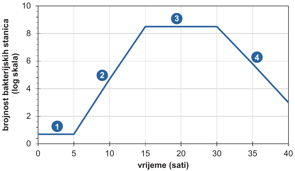 Pozorno promotrite sliku koja prikazuje promjene brojnosti jedinki u populaciji bakterija na hranjivoj podlozi tijekom vremena. Pojedine faze u životu populacije označene su brojevima od 1 do 4.