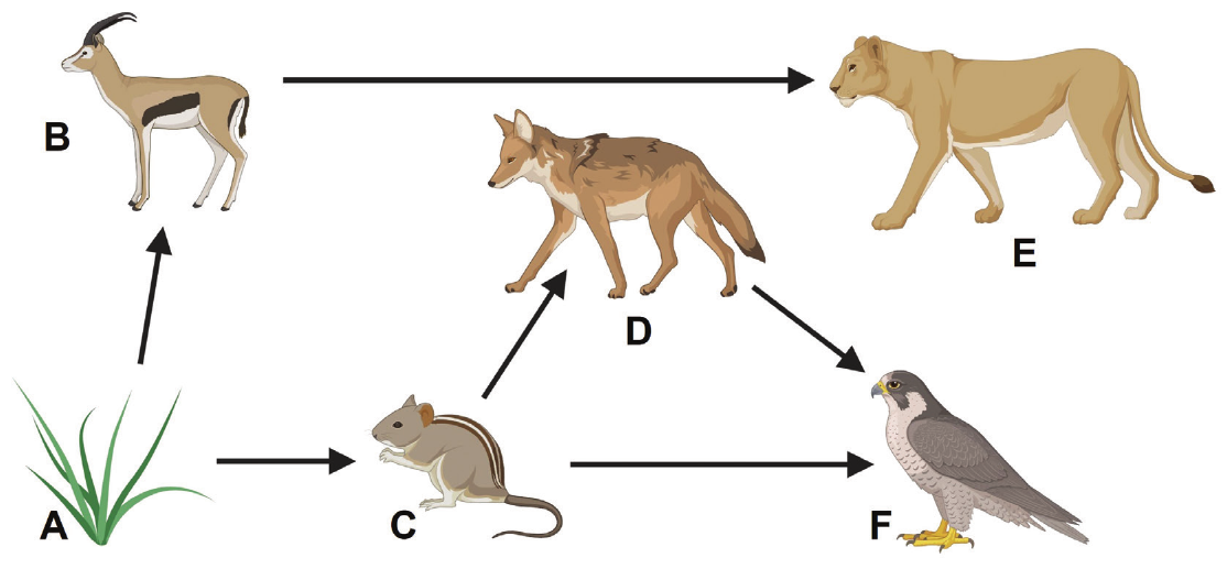 42.1. Kojim su sve slovima označeni članovi prikazane hranidbene mreže koji služe kao izvor ugljika za razlagače?