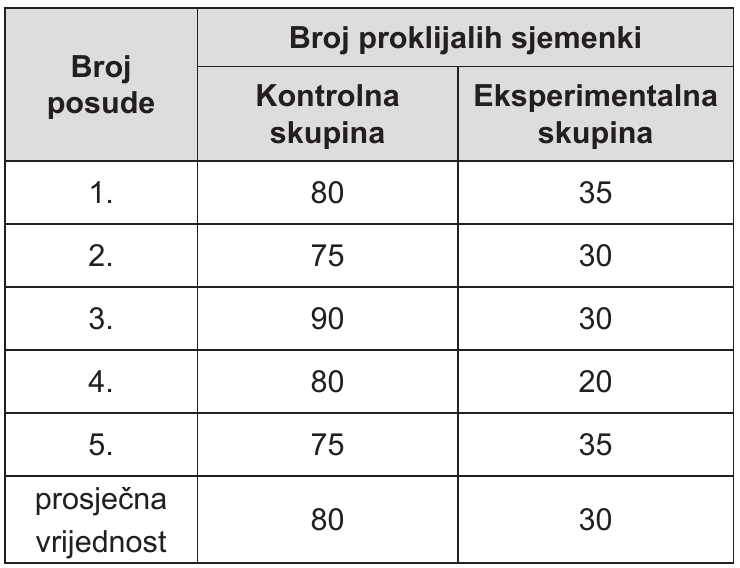 Učenici su proveli istraživanje utjecaja vanjskih (abiotičkih) čimbenika na klijavost sjemenki graha tijekom jednoga tjedna. Za sadnju su koristili deset posuda s tlom jednakoga sastava u koje su posadili po 100 sjemenki. Sjemenke kontrolne skupine uzgajali su pri $25^{\circ} \mathrm{C}$, a sjemenke eksperimentalne skupine pri $10^{\circ} \mathrm{C}$. Svi ostali uvjeti bili su istovjetni. Pozorno promotrite tablicu koja prikazuje rezultate istraživanja nakon jednoga tjedna.
