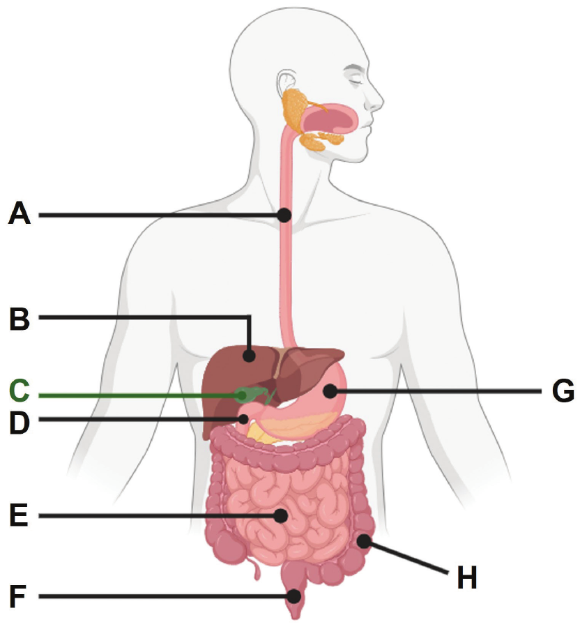 Pozorno promotrite sliku na kojoj su slovima od \(\mathbf{A}\) do \(\mathbf{H}\) označeni neki dijelovi probavnoga sustava čovjeka.